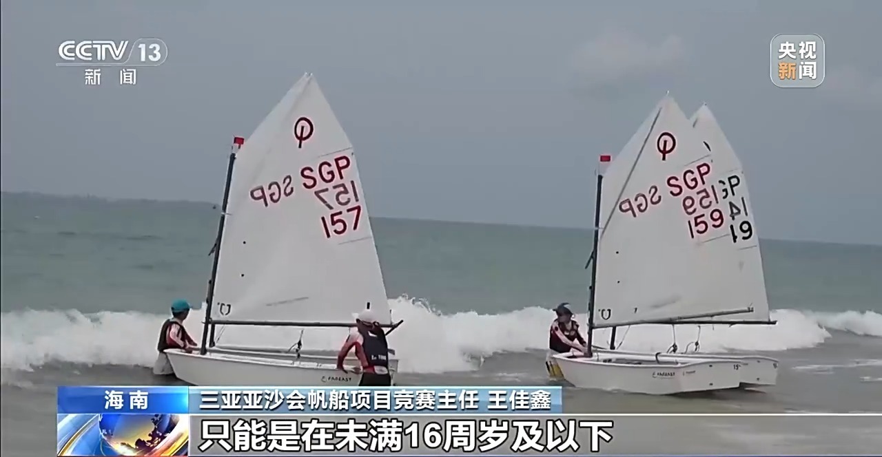 三亚亚沙会帆船项目竞赛主任 王佳鑫:现在在海上准备开始训练的,就是整个亚沙会所有项目里面年龄最小的一个项目,它叫OP帆船,参与这个船的选手只能是在16周岁以下,也就是2011年的1月1日以后出生的选手。自己去调试桅杆,自己去推着船下海,自己去比赛。